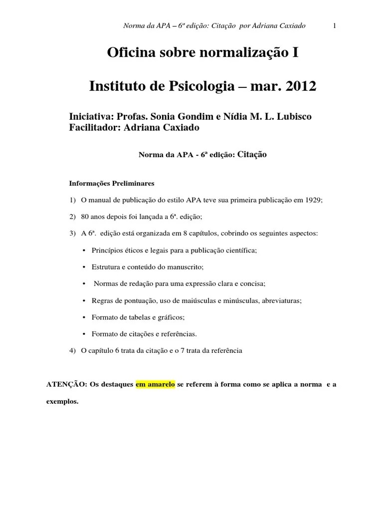 Os elementos contidos na citação devem ter a seguinte ordem (autor, data, p.)... E indicar a sua localização exata na fonte. No final do trabalho, artigo, etc., uma lista das referências bibliográficas fornece a informação completa sobre a publicação da fonte. O formato apa é usado para preparar artigos acadêmicos. Luego, puedes aclarar la naturaleza única de su fuente simplemente acreditando al autor del capítulo en su narrativa e identificando el número del capítulo como parte de su. Todos os autores citados no texto, e apenas eles, devem estar presentes nas referências com as informações completas.